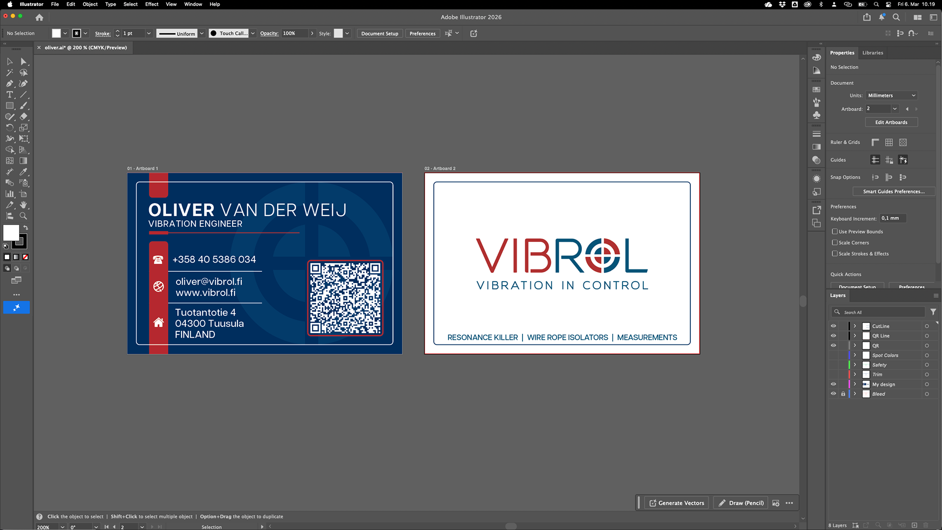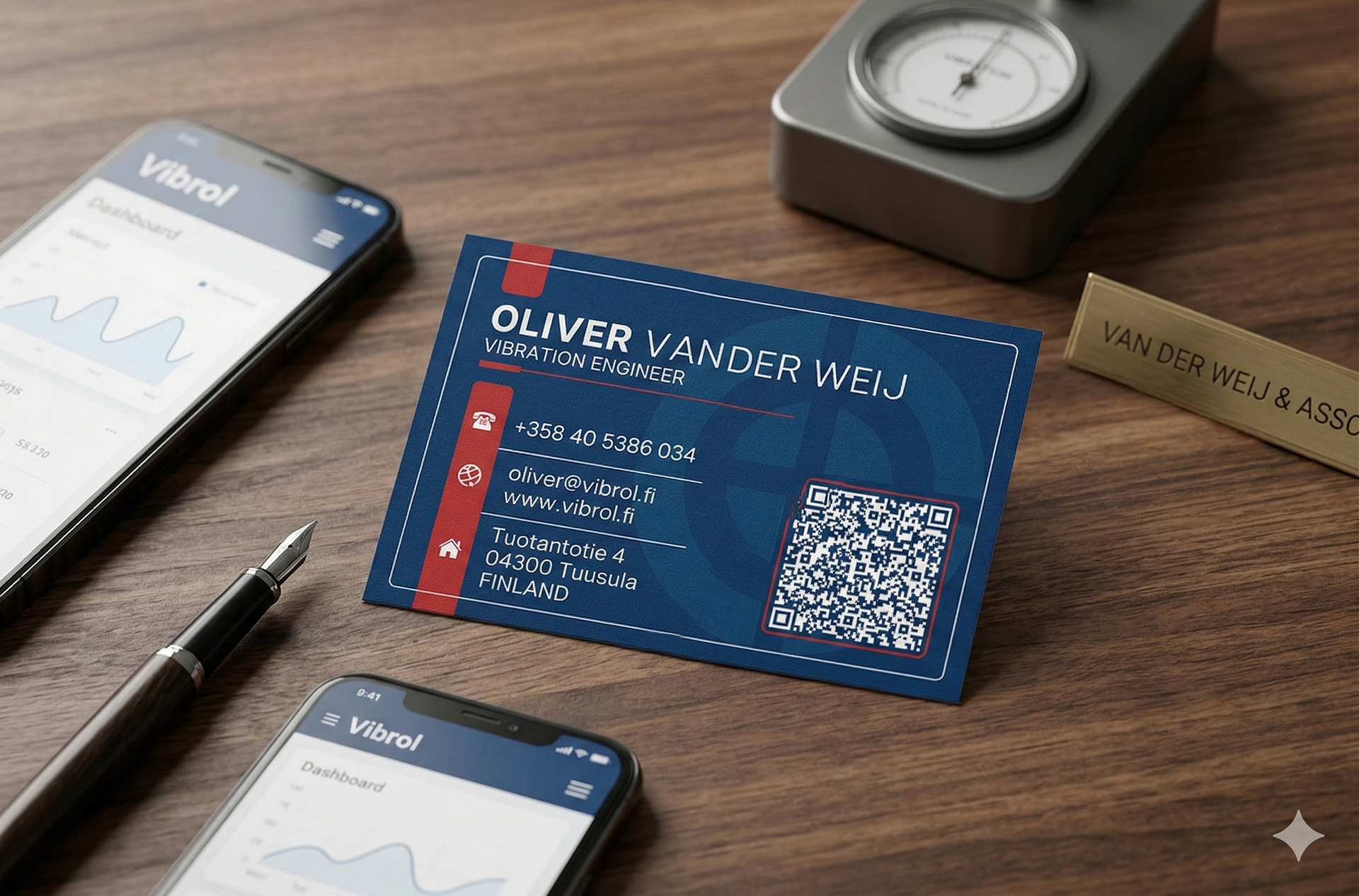 For this business card design, I focused on creating a high-impact visual identity that reflects the precision and technical nature of vibration engineering. The layout utilizes a bold navy and industrial red palette to establish professional authority while ensuring key contact details remain highly legible. I integrated a subtle crosshair motif in the background to symbolize diagnostic accuracy and the "blueprinted" feel of the engineering sector. To bridge the gap between physical and digital networking, I prioritized a prominent QR code framed for maximum visibility. The final result is a modern, structured aesthetic that balances industrial grit with clean, sophisticated information architecture.