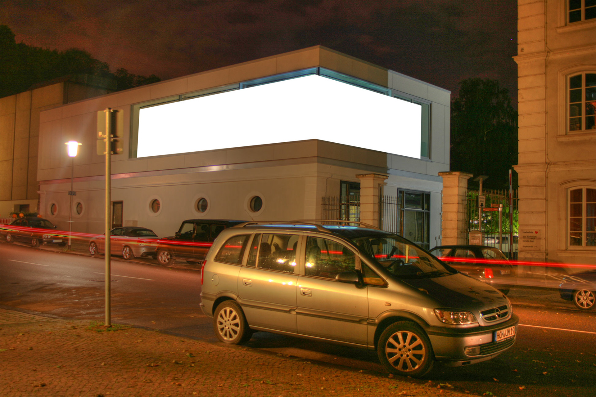 The HBKsaar media facade is a back projection screen, operated with five projectors inside the room. Creating the visuals in a certain way and observed from the right location the media facade gives the impression of things happening inside the room and on the windows.